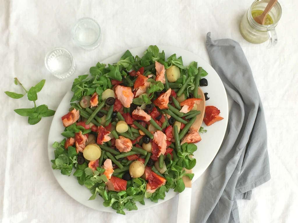 Nu voeg ik de warmgerookte zalm toe aan een eenvoudige salade met sperziebonen en krieltjes. Terwijl de boontjes en aardappeltjes koken, maak je de rest van de salade klaar.