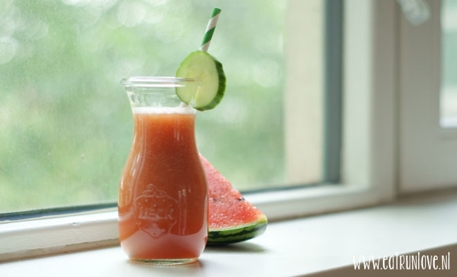 Nu er weer een aantal warme dagen voor de deur staan, is dit een heerlijke, verfrissende juice. Wisten jullie dat meloenen en komkommers familie van elkaar zijn? Ik wist dat niet, maar meloen is eigenlijk ook een groente. Watermeloen doet zijn naam eer aan en bestaat voor bijna 95% uit water. In het roze vruchtvlees van watermeloen zitten veel vitamines en mineralen en weinig calorieën. Vitamine A, C en D en de mineralen ijzer, magnesium, koper en zink zitten onder andere in watermeloen en zijn goede bronnen voor een stralende huid. Door de hoeveelheid water blijf je gehydrateerd en daarnaast is het een natuurlijke ontgifter voor het lichaam.