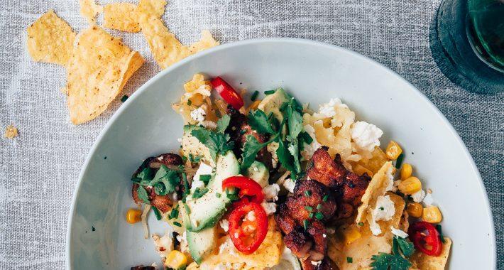 In dit nachos recept heb ik ook nog wat frisse smaken gebruikt, als tegenhanger voor de romige kaas en de pittige kip. Je kunt zelf er ook andere smaken bij bedenken maar ik vond de frisse en romige avocoado, een pittig peper en geroosterde mais er erg mooi bij passen. Uiteindelijk voeg je ook nog feta en geraspte kaas toe. Dan gaan de nachos onder de grill tot dat de kaas gesmolten is. Heerlijk met koriander, fijngesneden bieslook en zo’n fris limoentje.
