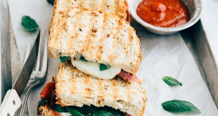 Ingrediënten voor 1 tosti 2 sneetjes brood 1 el tomatenpassata Peper en zout Snuf oregano 2 plakjes salami 0,5 bol buffelmozzarella Takje basilicum
