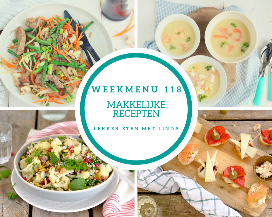 Hoe zit het met jullie zomerse gevoel? Ik heb zin om heerlijke lichte en zonnige recepten online te zetten. Maar doe die flinke buien van de week en zelfs kou, weet ik af en toe niet meer in welk seizoen we zitten. Het weekmenu heb ik toch maar lekker zomers gemaakt met een maaltijdsalade met bloemkool, een gezond roerbak gerecht, een stamppot met aubergine en vrijdag staat er een borrelhap klaar.