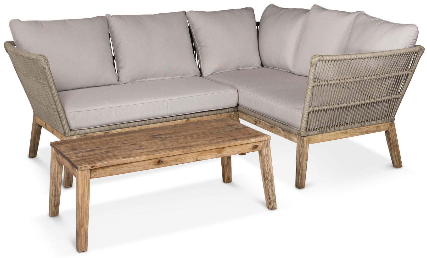 Het stevige, aluminium frame ligt verborgen onder het polyester koord, wat het hele meubel omspant. Het onderstel van deze set en de tafel bestaan uit hardhout met een vintage teak-look. De hoekbank wordt compleet geleverd met bijbehorende kussens. Deze hebben een comfortabele dikte en zijn afneembaar met een vochtige doek.