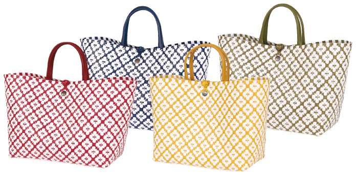 Beachgirl of shopgirl?Badlaken, water, groente en fruit: met de PU leren, zachte hengels til je de tas zo op. Het unieke design is gebaseerd op de Portugese tegelpatronen, grafische elementen en heldere kleuren. Beschikbaar in vier verschillende kleurencombinaties, handgemaakt van 70 procent gerecycled plastic.