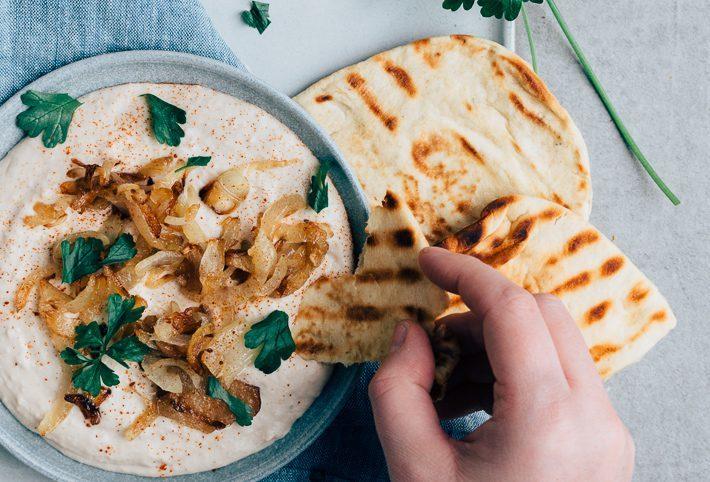 Witte bonen hebben niet een hele sterke smaak van zichzelf en dit zorgt er voor dat je heel eenvoudig lekkere smaken kunt toevoegen. De tahin, knoflook en komijn geven die typische smaak van hummus. Voor nog wat extra smaak voegen wij gecarameliseerde uitjes toe. De hummus van witte bonen is lekker romig. Serveer er wat naanbrood bij en dippen maar!