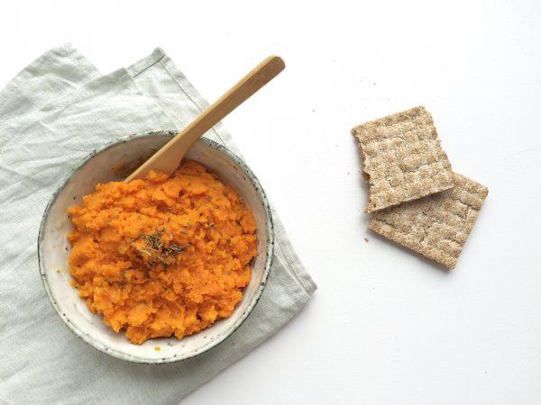 Deze wortel-gember spread is geheel plantaardig en lekker op een boterham, in een wrap of op cracker.