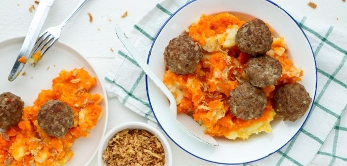 Wortel pompoenstamppot met pittige gehaktballetjes