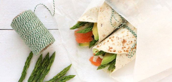 Nog 2 dagen en dan start officieel het aspergeseizoen weer. Hartstikke leuk, en lekker natuurlijk, maar ik had eigenlijk helemaal geen zin om te wachten... want er liggen nú al asperges in de winkel, dus ik wilde nú aan de slag!! Vooral de groene asperges gebruik ik erg graag, maar dat komt omdat die bij mij makkelijk in de pan passen. Voor de witte asperges heb ik geen pan die groot genoeg is... En stiekem vind ik de groene asperge ook net even lekkerder... Vandaag een recept voor een makkelijke lunch wrap met groene asperges en zalm, een gerechtje dat je trouwens ook perfect mee kunt nemen naar werk of school.