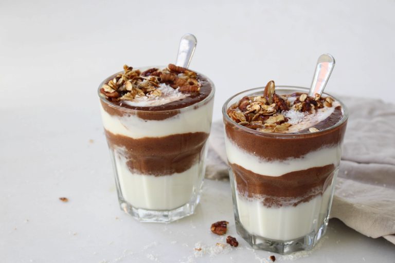 Dit heerlijke, romige ontbijtje is ook nog eens voedzaam en helemaal plantaardig. De banaan, haverlokken en cacao geven je energie, en de yoghurt en noten zorgen voor de eiwitten. Een perfect ontbijt om je dag mee te starten.