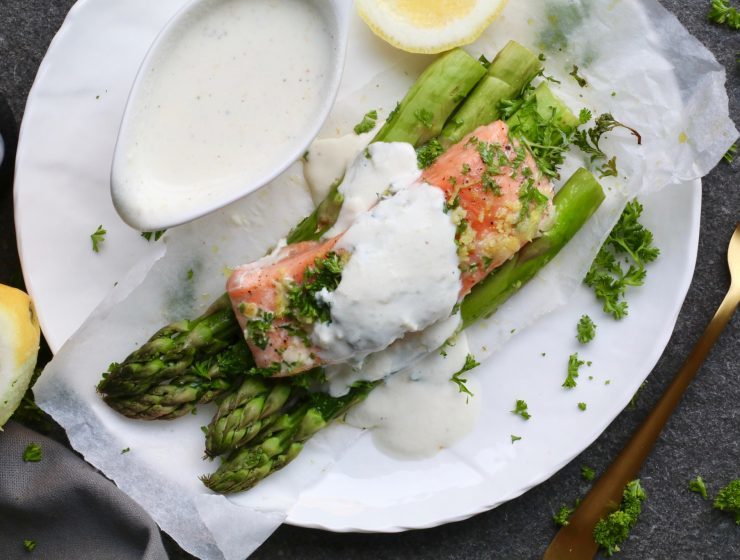 Zalm-asperge pakketjes uit de oven met citroen roomsaus