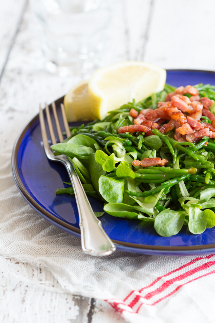 Om te beginnen besloot ik er een eenvoudige salade mee te maken. Een groot succes, al zeg ik het zelf. Dit staat niet alleen binnen 10 minuten op tafel, maar het is ook nog eens heel erg lekker. Het zilte van de zeekraal, het zoute van de spekjes en dan nog een pittige mosterddressing. Ik vind ze heel goed samen gaan, maar mochten het naar jouw idee iets teveel uitgesproken smaken zijn, dan kun je de spekjes altijd weglaten.