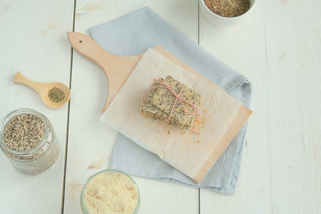 Een vriendin van mij eet al een tijdje koolhydraatarm en is erg enthousiast over haar eigen zelfgemaakte crackers. Alleen gebruikte zij nog behoorlijk wat lijnzaad. Ik heb haar recept aangepast, door er ook zonnebloempitten aan toe te voegen. De Parmezaanse kaas en de Italiaanse kruiden zorgen voor een extra hartige smaak. Hierdoor misstaan de crackers niet bij de borrel.