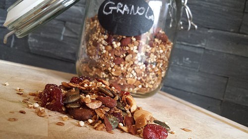 Granola kan je met alle gewenste soorten noten, pitten, superfoods of gedroogd fruit maken. Doe er dus vooral in wat jij lekker vindt, en probeer eens nieuwe combi's uit. Eet het vervolgens met rijstmelk of geitenyoghurt en je hebt een super gezond ontbijtje. Maak in één keer een grote hoeveelheid granola, stop het in een leuke weckpot en je bent voor de komende week klaar =D