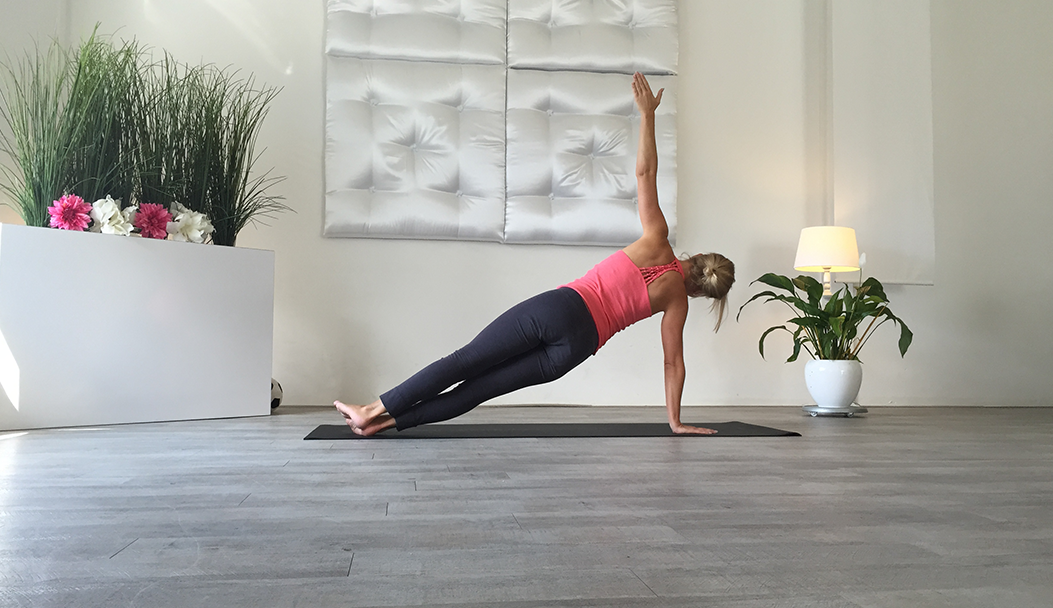 Dit is een basishouding: balansoefening op één arm. In yogajargon heet deze houding “Vasisthasana”. Vasistha betekent een wijze; de beste; de rijkste, de uitmuntende. Deze asana wordt ook wel de ‘Houding van de wijze Visistha’ genoemd. De grootste uitdaging in deze houding ligt bij de zwaartekracht, de mentale focus en in het behouden van een neutrale as van de wervelkolom. Door de zijwaartse houding werken de spieren tegen de zwaartekracht in wat inspanning vraagt van spieren en gewrichten om in de houding te blijven.