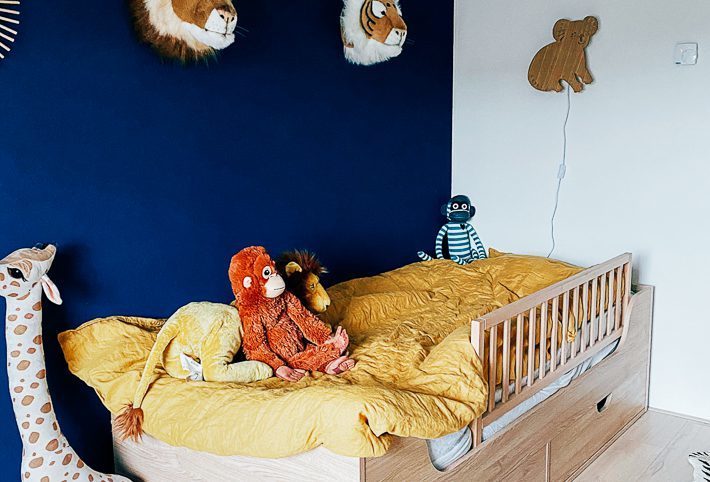 Ga je voor een peuterbed of voor een eenpersoons? Dat was de vraag van de dag en ik kwam er maar niet uit. Ik zag Merlijn nog niet in zo’n groot bed liggen. Aan de andere kant was het wel handig want dan kon één van ons er in ieder geval naast liggen. Uiteindelijk zijn we toch voor een eenpersoonsbed gegaan. Deze is van Made.com Hij is wel een beetje hoog, maar daar hebben we een leuk krukje (van Liewood) voor gekocht en hij kan er nu zelf in klimmen. Het dekbed is van H&M.