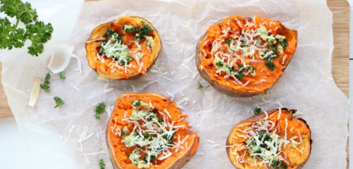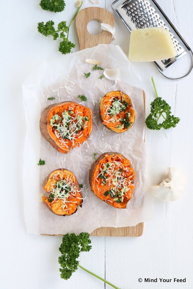 Van zoete aardappel krijg ik maar niet genoeg. Ik blijf er maar mee koken, en de ideetjes voor nieuwe recepten ontstaan als vanzelf. Oh, mijn lichtelijke Pinterest verslaving (volg je mij daar al?) helpt ook wel mee hoor.... Als ik ’s avonds op de bank zit, scroll ik door al die heerlijke foodfoto’s en krijg ik spontaan weer trek... En zin om aan de slag te gaan. Vandaag een recept voor zoete aardappel met knoflook en Parmezaan, een makkelijk bijgerecht dat ik bij een stukje zalm at. Nog wat extra veggies op tafel en dan is de maaltijd voor mij compleet!