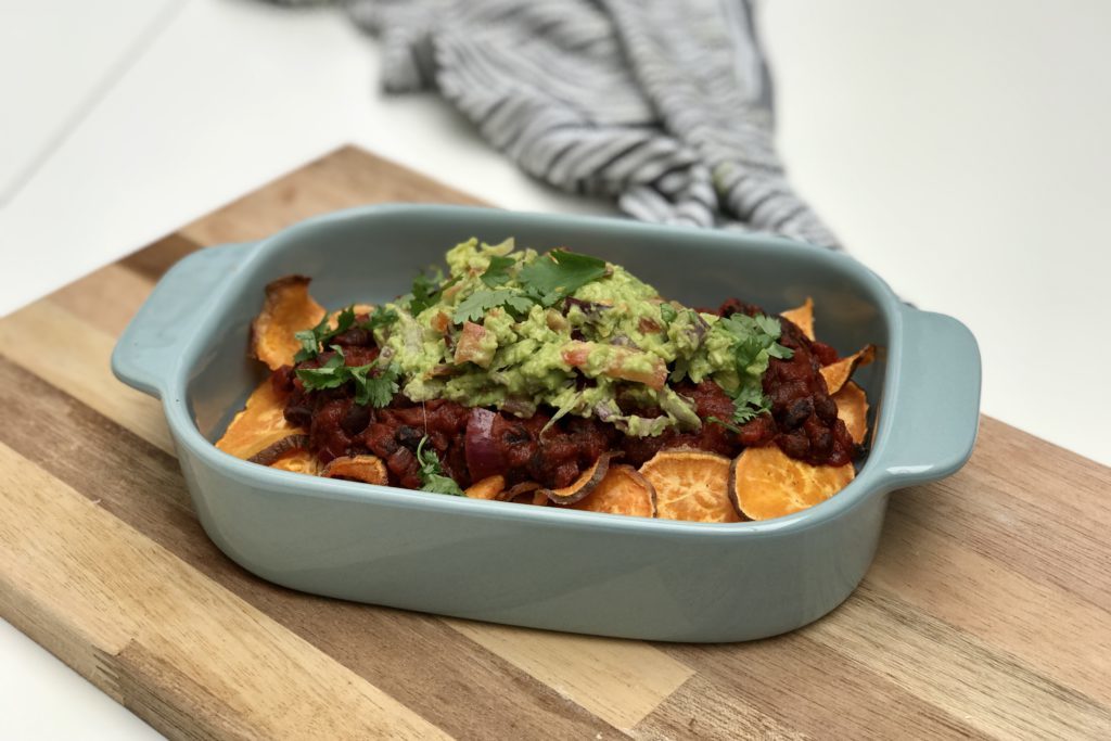 Als je het mij vraagt, zijn nacho’s hét ultieme comfortfood. Op een terrasje, tijdens een etentje met vriendinnen, op de bank onder een dekentje… Het is supereasy om te maken en je kunt er lekker mee variëren: bijvoorbeeld zelf chips maken, verschillende soorten bonen gebruiken, veggies, (geiten)kaas of zelfgemaakte tomatensalsa toevoegen. Een gezondere variant van dit comfort food gerecht (zoals deze gezondere variant van pizza) mag daarom niet ontbreken op ILH. Ik maakte deze (vegan) nacho’s van zoete aardappel en topte deze af met een simpele chili met zwarte bonen en home made guacamole. Deze zoete aardappel nacho’s zijn minstens net zo lekker!