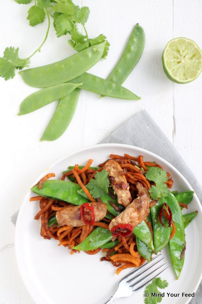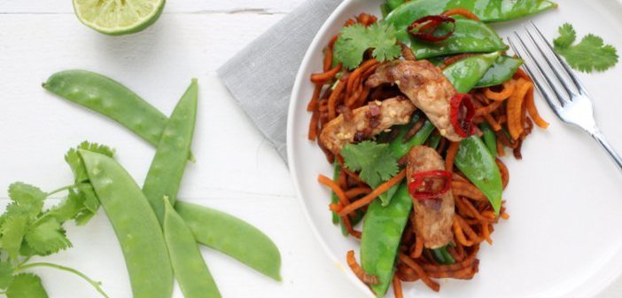Ik neem het me al anderhalve week voor. We moeten weer een beetje normaal gaan doen… Op de een of andere manier lijkt het vakantieritme hier nog niet helemaal uit te slaan. We gaan te laat naar bed, de maaltijden zijn makkelijk, en ik heb steeds het idee dat ik achter de feiten aan loop. Ik merk dan dat het voor mij altijd werkt om maar drástisch het roer om te gooien en mijn koelkast vol te stoppen met groenten. En dan gewoon weer te gaan koken. Deze zoete aardappel noedels met peultjes en kip zette ik afgelopen week op tafel, en ik keur het goed! Welcome back, greens!