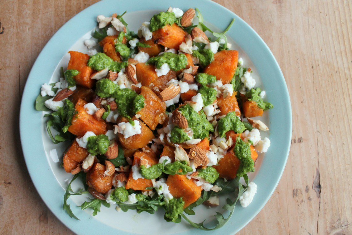 Toen ik laast uit eten was probeerde ik een zoete aardappel taartje met geitenkaas. Wat zijn die twee een goede combi! Dat moest ik zelf natuurlijk ook even proberen. En al is deze versie niet zo fancy als die ik heb geproefd, hij is toch heel geslaagd. Deze zoete aardappel salade voldoet prima als volledige avondmaaltijd. Of als een mooi kleurrijk voorgerecht als je de porties wat kleiner houdt. En super makkelijk te maken! Je kunt de amandelen ook vervangen door pijnboompitjes als je die in huis hebt, ook erg lekker!