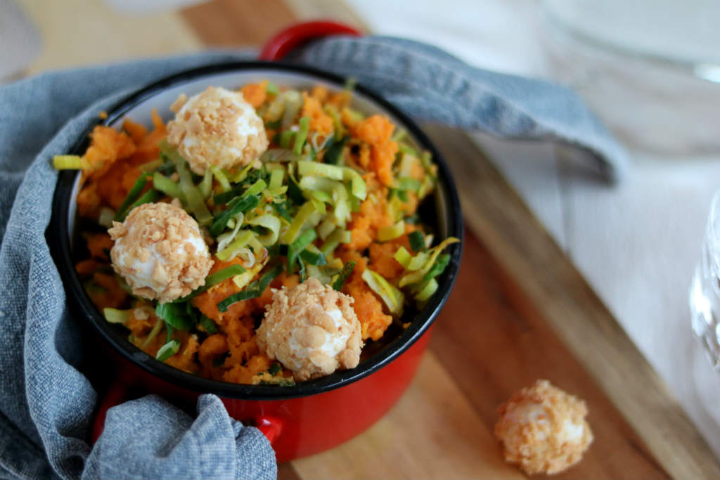 Hoe is het met jullie Januari blues? Door de griep lijkt het bij mij of 2018 nu pas is begonnen. En ik heb zo’n zin in dit jaar. Mijn hoofd stroomt over met ideetjes en het zijn er zoveel, dat ik niet weet waar ik zal beginnen. Ik heb mezelf even streng toegesproken om eerst een aantal blogs en nieuwe recepten uit te werken. Zo in het begin van het nieuwe jaar staan er veel stamppotten bij ons op tafel. Het is makkelijk, voedzaam en lekker. Deze zoete aardappel stamppot met prei en geitenkaas balletjes is weer eens iets anders.