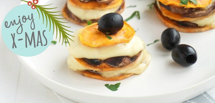 Vandaag deel ik weer een bijgerecht uit het MYF mix & match kerstmenu met je! En dit is echt een heel eenvoudig recept..., maar ja, wie zegt dat lekker eten moeilijk moet zijn? Je hebt in feite maar een paar ingrediƫnten nodig, en vooral de oven doet hier gigantisch goed zijn werk! Ik vind het altijd zo lekker om groenten in de oven klaar te maken, ze krijgen er nog meer smaak van. Ik koos voor zoete aardappel in combinatie met champignons en wat kruiden, en daarmee zet je deze makkelijke zoete aardappel torentjes op tafel! Ik serveer het als bijgerecht, maar je kunt er ook een klein voorgerechtje van maken.