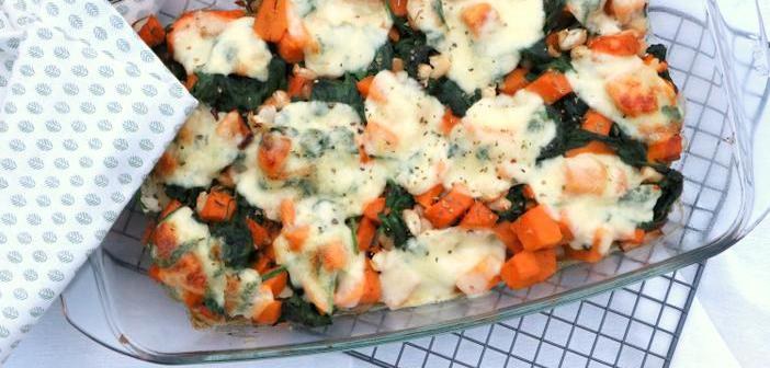 Goh, heb je het een beetje door, er is een fase gaande hier... Een fase die te maken heeft met zoete aardappels, en een fase die te maken heeft met makkelijk eten... Keek ik ergens half oktober nog ontzettend uit naar de winter en de bijbehorende stevige maaltijden, vandaag was ik ineens helemaal klaar met de net-niet kou en het druilerige weer. Samen met Lise dook ik de stad in en kocht een voorjaarsjas, om mijn onvrede een beetje kracht bij te zetten. En ik besloot om ook maar weer eens wat frisser te gaan koken. Geen zware gerechten, maar nog wel een receptje uit de oven. Als een soort compromis, net als de winter die dit jaar blijkbaar gesloten heeft. Deze zoete aardappelschotel met spinazie en kip zou zowel op koude als warme dagen prima op tafel kunnen!