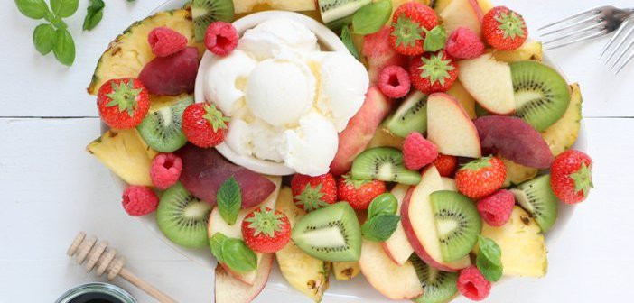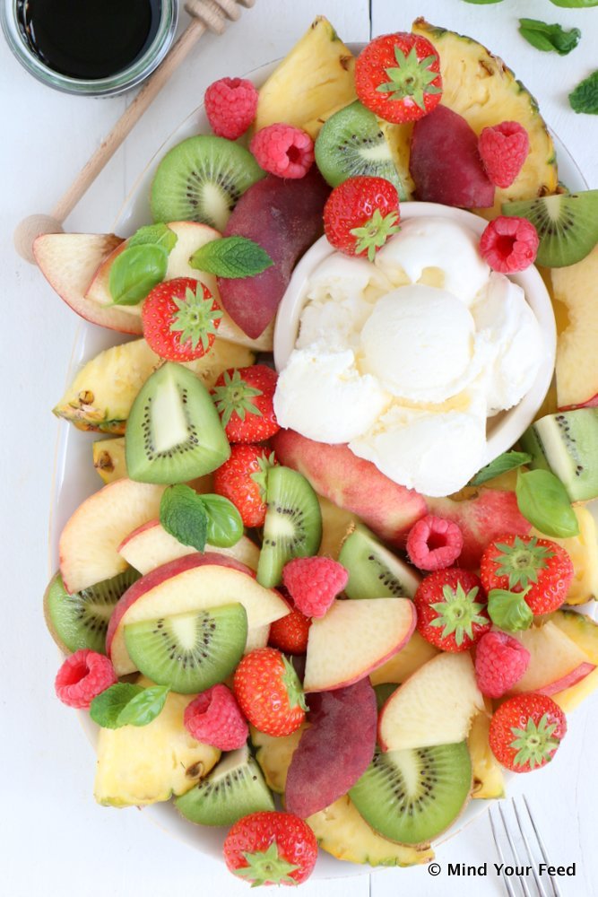 Oh hallo zomer! Wat ontzettend fijn dat je er bent. En wat breng je een hoop lekkers met je mee! Heerlijk, ik geniet er zo van… Ik heb al heel wat avondjes buiten mogen eten. Uitgebreide bbq’s met vrienden of een grote pan paella bij mijn ouders. Het tempo ligt rustig, we zitten uren aan tafel, ik kan er geen genoeg van krijgen. En dan als afsluiter van zo’n fijne avond zet ik graag een zomerse fruitsalade op tafel. Ziet er toch geweldig uit! Leg er wat vorkjes en lepeltjes bij en iedereen prikt lekker mee!