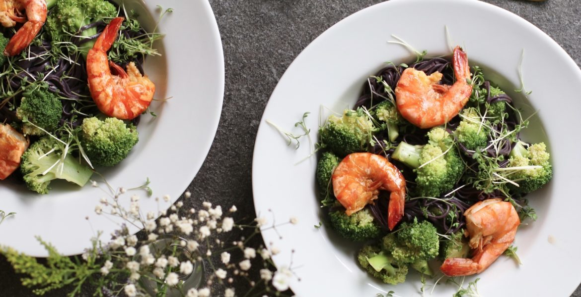 Dit heb je nodig voor deze zwarte rijstnoedels met knoflook scampi’s / twee personen