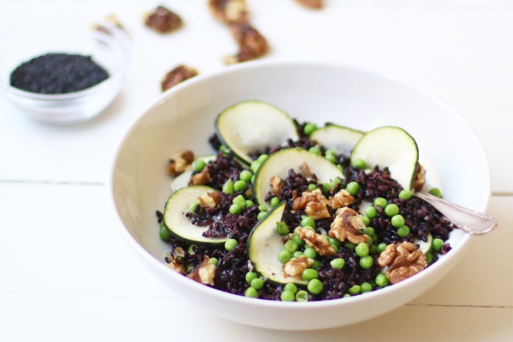 Ik ben ontzettend gek op salades als lunch en gelukkig zijn de salades van tegenwoordig niet meer alleen een combi van sla, tomaat en komkommer. Sterker nog, deze zwarte rijstsalade met geroosterde walnoten en honing dressing bevat niet eens sla. Wél 200 gram groenten dus als je deze salade eet tussen de middag ben je al een aardig eind op weg om de 350 gram groenten te halen! Dit is het minimum wat ik zelf elke dag probeer te eten. Soms vind ik het lastig – helemaal als ik een hele dag van hot naar het ren – en op een dag waarop ik weinig tijd heb om te eten maak ik een salade met extra veel groente. De rijst kook ik de avond van te voren zodat ik alles de volgende dag alleen nog maar even door elkaar hoef te husselen.