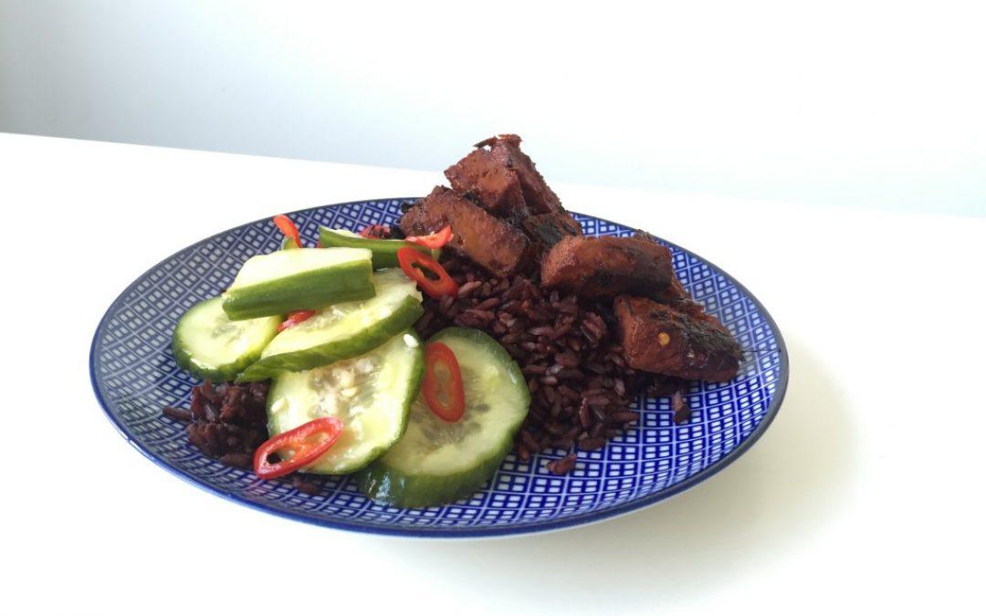 Thuis in de Oosterse keuken ben ik nog niet helemaal, want de smaken in deze gerechten vind ik erg lekker, maar vind ik soms heel erg moeilijk om na te bootsen. Na veel proberen is het me toch gelukt: een salade met zwarte rijst, pittige tofu en ingemaakte komkommer met een Koreaans tintje is het resultaat.